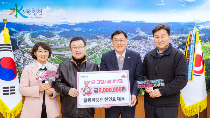 한인호 씨는 고령군에 소재한 농산물 운반대(이동랙) 및 범용 파렛트 제작 업체 합동파렛트의 대표로, 지역 산업 현장에서 성실한 기업 경영을 이어가는 동시에 매년 합천군 고향사랑기부제에 꾸준히 참여하며 지역사회에 귀감이 되고 있다. 특히 한인호 씨의 기부는 일회성 후원이 아닌 매년 지속적으로 이어진 기부라는 점에서 고향사랑기부제의 취지를 잘 보여주는 모범 사례로 평가된다.