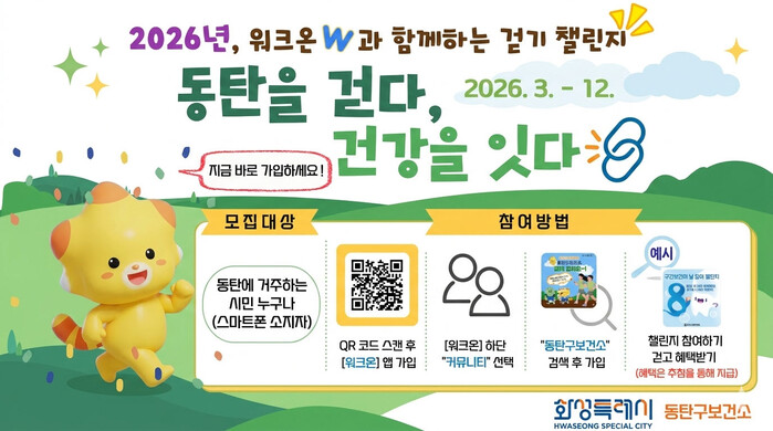 이번 사업은 모바일 걷기 앱 ‘워크온(WalkON)’을 활용해 진행된다. 스마트폰을 사용하는 동탄구 주민이라면 누구나 무료로 참여할 수 있으며, 앱 설치 후 ‘동탄구보건소 공식 커뮤니티’에 가입하면 다양한 걷기 챌린지에 참여할 수 있다.