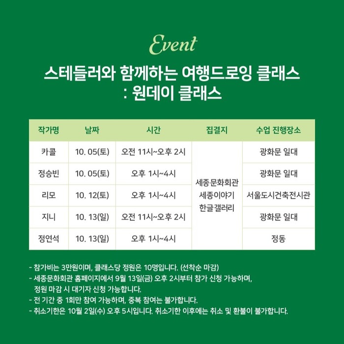 이번 원데이 드로잉 클래스는 ‘여행자의 시선으로 우리 일상 살아가기’란 주제에 맞춰 스테들러 지원 작가의 멘토링에 따라 삶을 더 다채롭고 풍성하게 기록하는 시간들로 채워질 예정이다. 참가자는 클래스당 10명씩 선착순으로 모집되며, 9월 13일부터 세종 아카데미 홈페이지에서 신청이 가능하다.