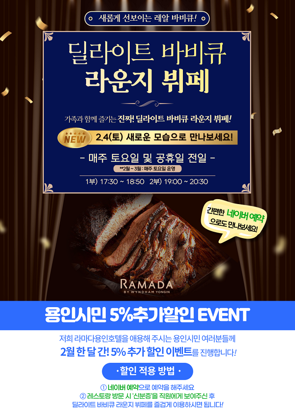 라마다용인호텔은 ‘딜라이트 바비큐 라운지 뷔페’ 리뉴얼을 기념해 네이버 예약을 통해 예약 및 결제를 진행하는 고객에게 10% 할인 쿠폰을 제공한다.