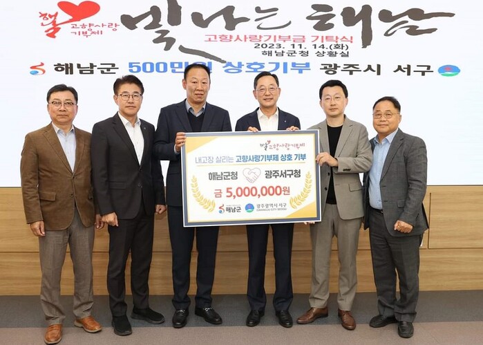 [해남=정찬남 기자] 전남 해남군과 광주시 서구는 고향사랑기부제 활성화를 위해 십시일반 모은 고향사랑기부금 500만 원을 상호지역에 기부했다.