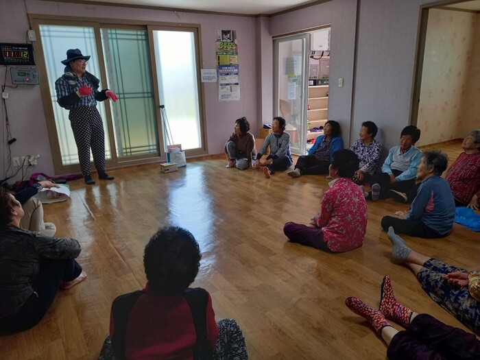 | ▲ 강진군 관계자가 경로당 이용 어르신들 대상으로 진드기 물림 예방을 위한 올바른 의복 착용 교육을 하고 있다. / 강진군 제공 |