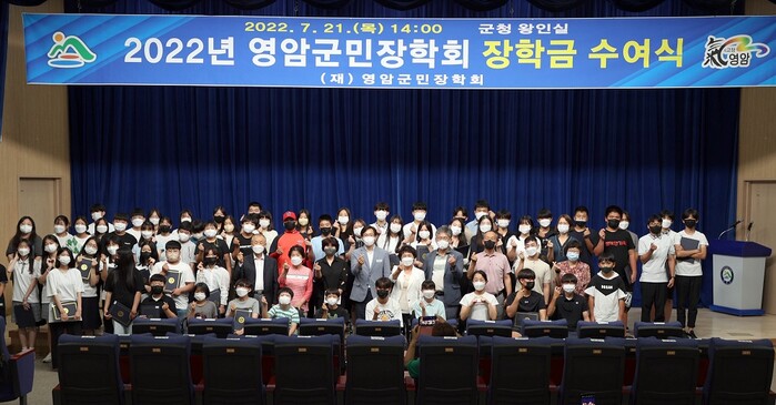 | ▲ 우승희 재단법인 영암군민장학회 이사장(영암군수 / 두 번째 줄 가운데)이 지난 2022년 7월21일 군청 왕인실에서 2022년 영암군민장학회 장학금 수여식을 가진 후 학생 및 관계자들과 기념촬영을 하고 있다. / 영암군 제공 |
