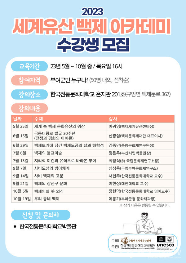 부여군민은 누구나 신청 가능하며, 강의별 선착순 50명까지 사전 신청을 해야 수강이 가능하다. 단 강의별 일정이 변동될 가능성도 있으므로 자세한 사항은 한국전통문화대학교 박물관으로 전화 또는 전자우편으로 문의하면 된다.