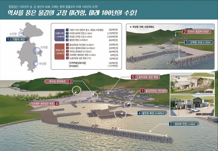 어촌뉴딜사업에 선정된 미라항은 항일 운동기념관 VR체험관 제작, 대표 특산물인 물김을 ‘태극섬김’으로 브랜드화해 차별화된 콘텐츠 구축, △기항지 개선 △미라항 방파제 연장(L=44m) △물양장 확장(A=600㎡) △ 부상항 선착장 조성(L=25m) 등이 조성되고 있다.