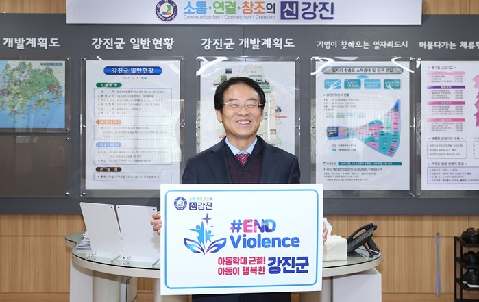 [강진=정찬남 기자] 끊이지 않고 증가되고 있는 아동·청소년을 향한 물리적, 정신적 폭력 상황에 국제사회가 연대해 적극 대응하고 있는 아동폭력근절을 위한 온라인 캠페인 ‘END violence’ 에 강진원 강진군수가 지난 7일 동참했다.