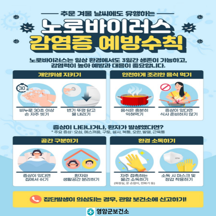 영암군보건소 관계자는 추운 겨울에 유행하는 노로바이러스 등을 예방하기 위해 ‘흐르는 물에 비누로 30초 이상 손 씻기’, ‘흐르는 물에 채소·과일 깨끗이 씻어 껍질 벗겨 먹기’, ‘음식물 충분히 익혀 먹기 등 개인위생 수칙 준수’를 당부했다.
