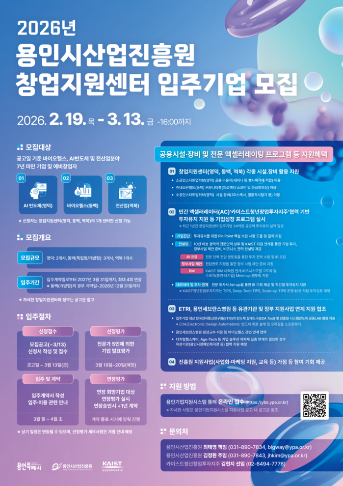 한편 2026년 창업지원센터 입주기업 모집도 현재 진행 중이다. 공고일 기준 사업 개시 7년 미만 기업 및 예비창업자를 대상으로 하며, 1차 모집 기한은 3월 13일(금)까지이다. 신청은 용인기업지원시스템을 통해 온라인 접수를 받고 있다.