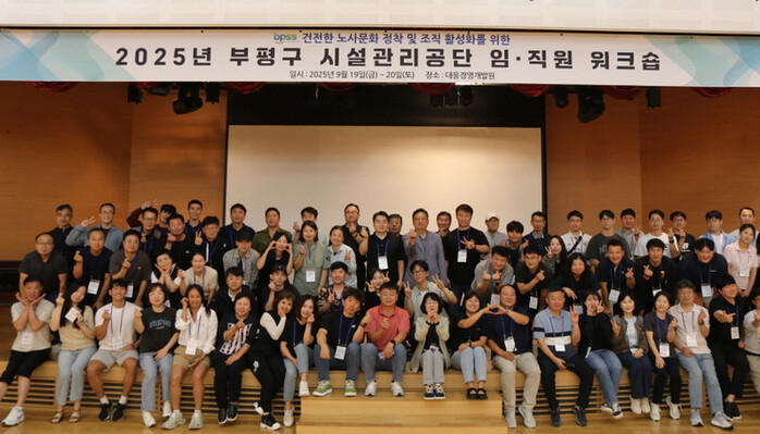| 부평구시설관리공단 ‘2025년 임직원 워크숍’ 참가자들이 포즈를 취하고 있다. (사진=부평구시설관리공단) |