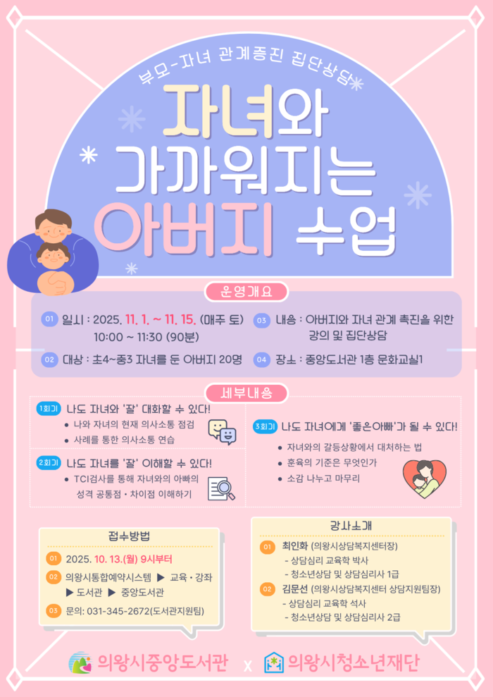 신청은 10월 13일 오전 9시부터 의왕시 통합예약시스템을 통해 선착순으로 진행되며, 관내 사춘기 자녀(초등학교 4학년~중학교 3학년)를 둔 아버지라면 누구나 프로그램에 참여할 수 있다.