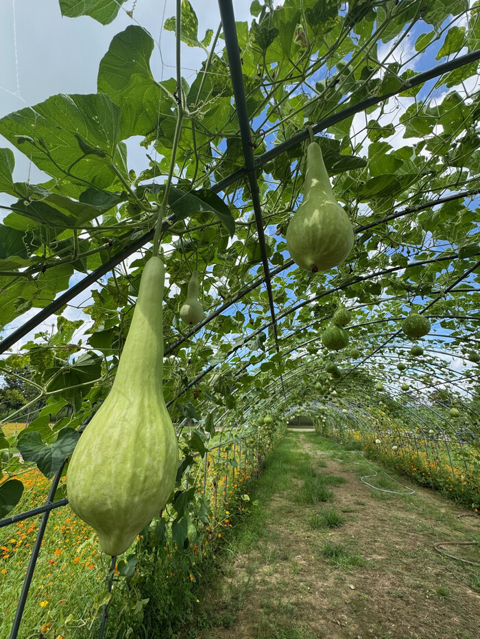 초화류단지 한편에는 전통 농경문화와 계절의 정취를 더하는 ‘박터널’이 조성됐다. 조롱박, 수세미, 여주, 뱀오이 등 10여 종의 덩굴식물이 주렁주렁 열려 초록 넝쿨을 장식하고 있다. 아이들에게는 신기한 자연 체험을, 어른들에게는 농촌의 향수를 불러일으키며 관람형 농업 콘텐츠로 주목받고 있다.