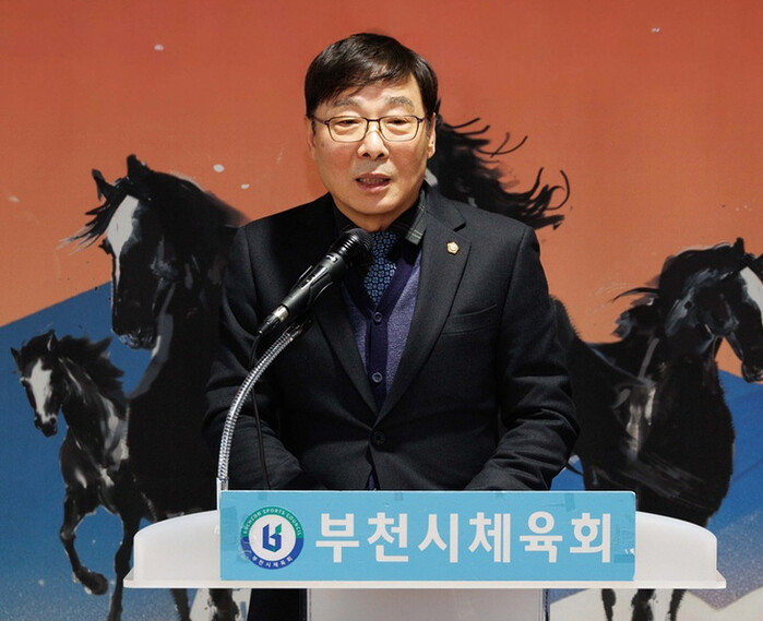 | 김병전 의장이 부천시체육회 신년 인사회에 참석, 축사를 하고 있다. [사진=부천시의회] |