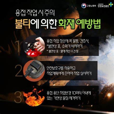 용접사용안전수칙은 ▲용접 작업 시 주변 가연물 제거 ▲ 용접 등 화기 취급 작업 시 화재감시자 배치 ▲ 용접작업 전 내부 잔류 연료 제거 및 세정조치 ▲용접 작업 후 작업장 주변 잔여 불씨 확인·점검 등이다.