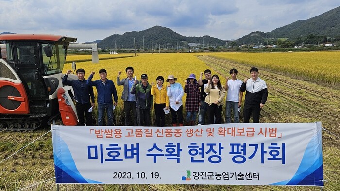 [강진=정찬남 기자] 전남 강진군(군수 강진원)은 지난 19일 성전면 수양리 ‘미호벼’ 재배 단지 포장에서 재배 농업인과 농업기술센터 관계자 10여 명이 참석한 가운데, 중간찰벼 ‘미호벼’ 품종 현장 자체평가회를 실시했다고 밝혔다.