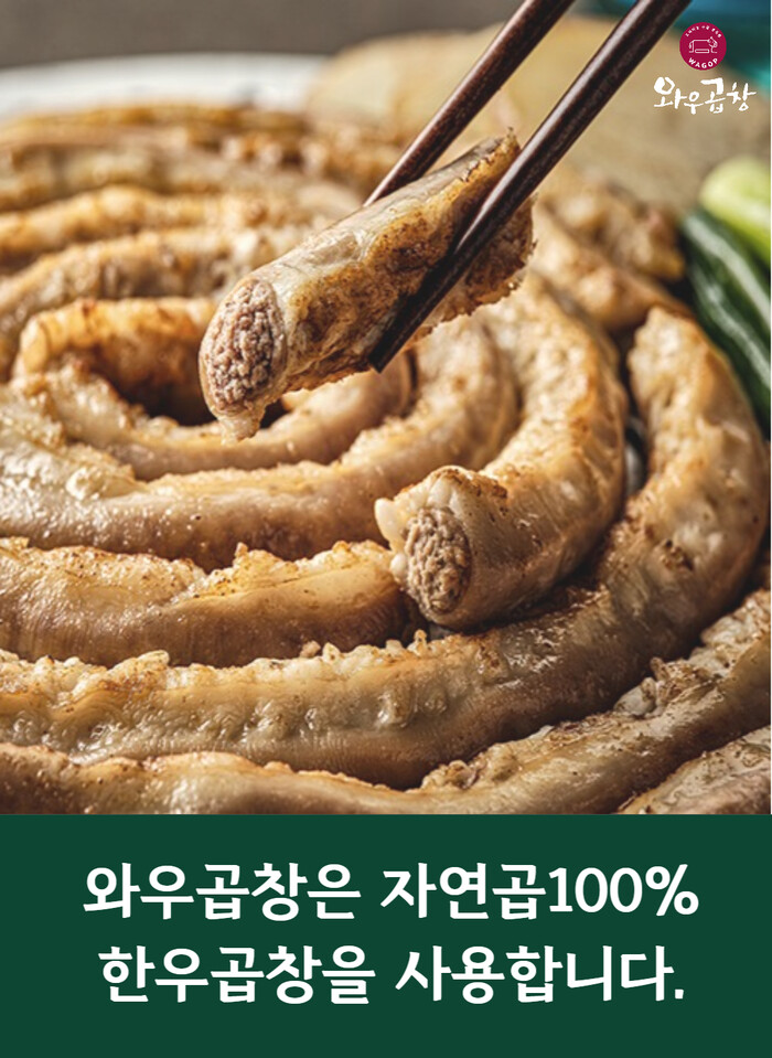 와우곱창은 화학연육제를 사용하지 않은 자연곱 100% 한우곱창을 사용하여 한우곱창 고유의 쫄깃하고 고소한 풍미를 제대로 느낄 수 있는 프리미엄 곱창을 선보이고 있다.
