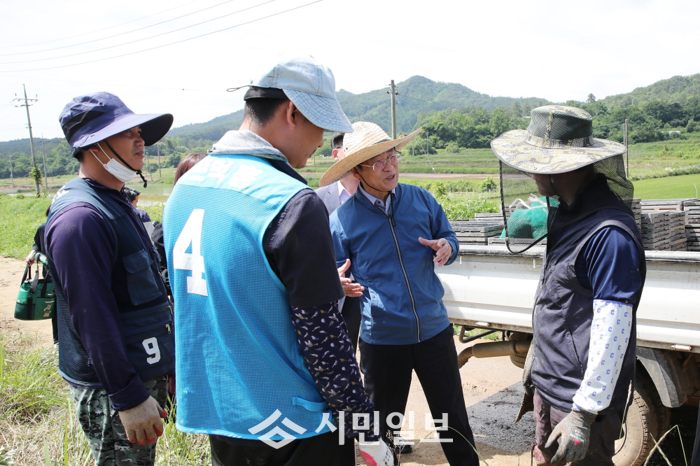 | ▲ 강진원 강진군수(사진 가운데)가 관내 건설 현장을 방문해 계절근로자를 활용하고 있는 관계자와 대화를 나누고 있다. / 강진군 제공 |