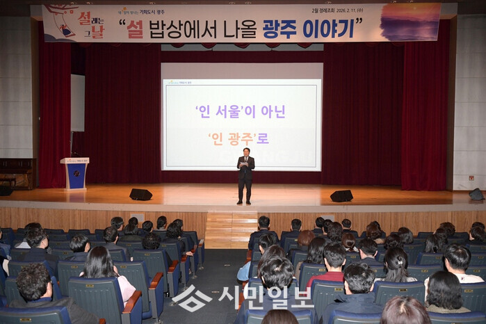 [광주=정찬남 기자] 광역시(시장 강기정)는 11일 시청 대회의실에서 ‘설 밥상에서 나올 광주 이야기’를 주제로 ‘2월 정례조회’를 개최, 통합으로 더 크고 깊어질 광주의 미래 구상을 공유했다.