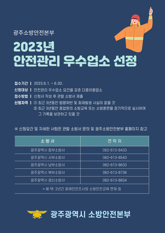 [광주=정찬남 기자] 광주광역시소방안전본부는 오는 6월 30일까지 자율안전관리 문화 정착을 위한 2023년 안전관리 우수 다중이용업소를 모집한다.