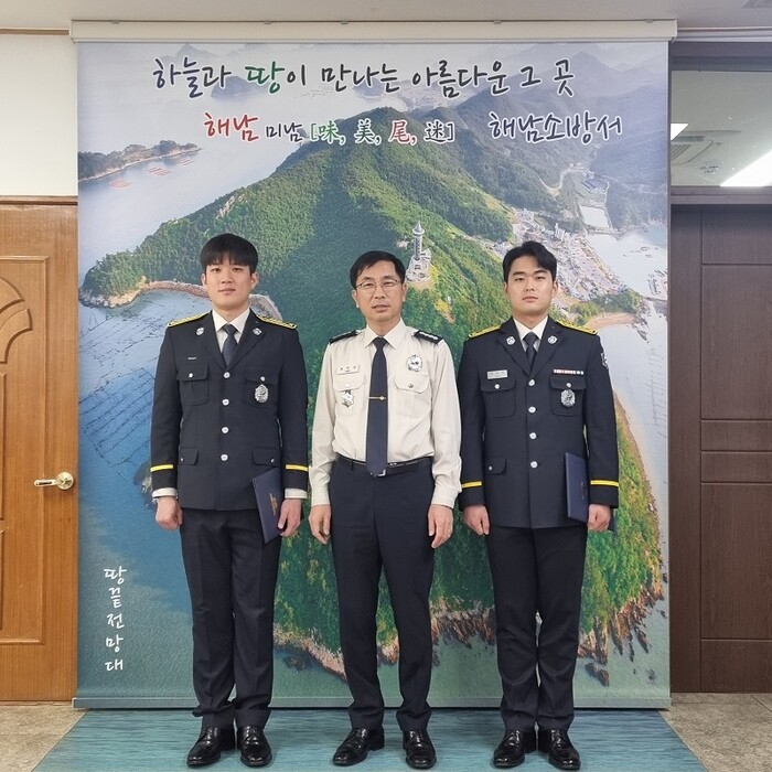 | ▲ 최진석 해남소방서장이 22일 서장실에서 신규 소방직원 임용식을 가진 후 기념촬영을 하고 있다. / 사진 왼 쪽부터 이종기 소방사 시보, 최진석 해남소방서장, 서한기 소방사 시보 / 해남소방서 제공 |