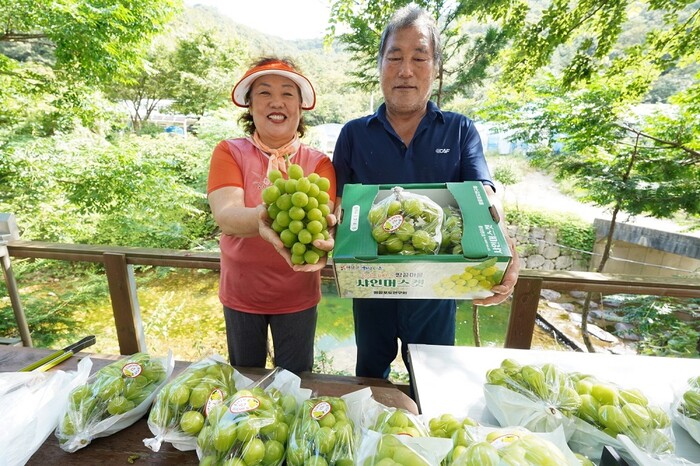 | ▲ 해남산 샤인머스켓을 재배하고 있는 해남군 삼산면 김재운(김부자 농가) 부부가 샤인머스켓 수확 후 기념촬영을 하고 있다. / 해남군 제공 |