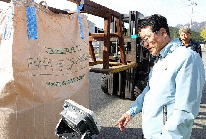 | ▲ 강진원 강진군수가 지난 8일 도암면 가루쌀 매입 현장을 방문해 저울에 올려진 톤백 가루쌀 무게를 확인하고 있다. / 강진군 제공 |