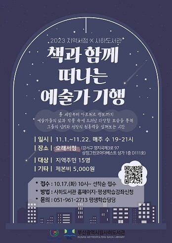 참가 희망자는 10월 17일 오전 10시부터 사하도서관 홈페이지 에서 선착순으로 신청하면 된다. 기타 문의는 사하도서관 독서문화과로 하면 된다.