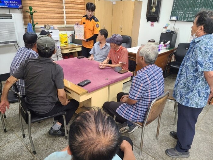 | ▲ 해남소방서 119생활안전순찰대, 관내 마을회관 및 경로당 쉼터 방문 취약 계층에 폭염 시 온열 질환 대비 행동요령 홍보 교육 / 해남소방서 제공 |
