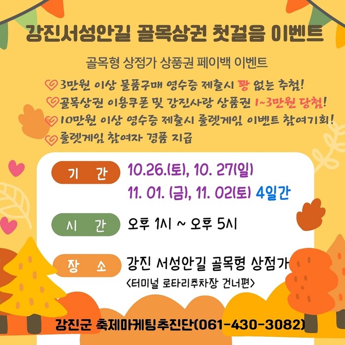 [강진=정찬남 기자] 전남 강진군이 ‘골목상권 첫걸음 이벤트’를 오는 26~ 27일, 11월 1일부터 11월 2일까지 나흘간 강진군 서성안길 일대에서 추진한다.