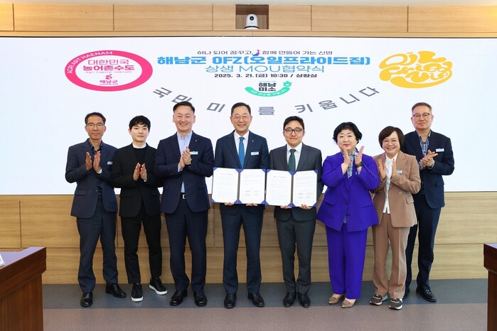 [해남=정찬남 기자] 명현관 전남 해남군수와 정원하 오일프라이드집(OFZ) 대표이사는 지난 21일 군청 상황실에서 업무협약을 맺고 해남 특산물을 활용한 신제품 개발과 공동 마케팅에 협력해 나가기로 했다.