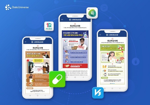 데이터유니버스는 국내외 인터넷에 있는 피싱사기 관련 빅데이터와 금융기관에 신고된 피싱사기 유형을 결합·분석하여 ‘신종 금융사기 예방 콘텐츠’를 제작하고 있다. 제작된 콘텐츠는 ‘스마트피싱보호’ 이용 고객들에게 매주 두 차례 알림으로 발송된다. ‘스마트피싱보호’는 휴대폰을 통해 발생하는 보이스피싱, 메신저피싱 등 전화금융사기를 예방하는 서비스이다.