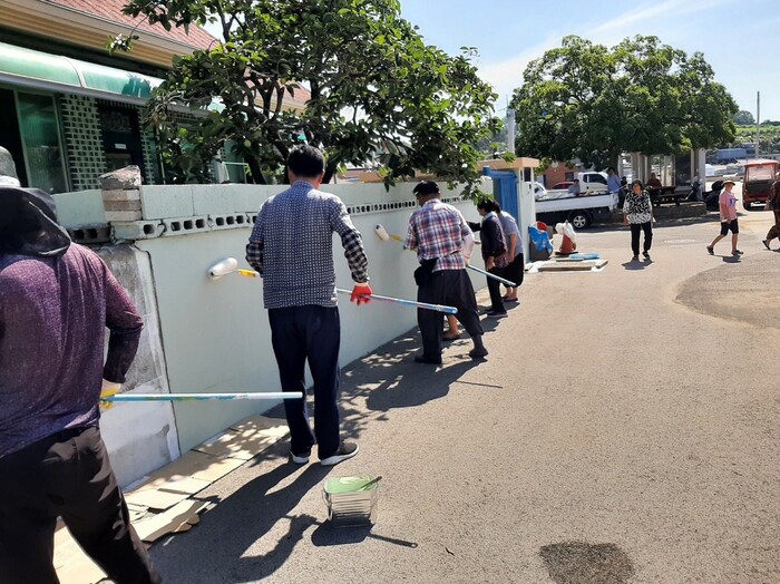 | ▲ 강진군이 올해 추진하는 ‘청정전남 으뜸마을 만들기’ 사업에 동참한 지역민들이 마을 담장 페인트 작업을 하고 있다. / 강진군 제공 |