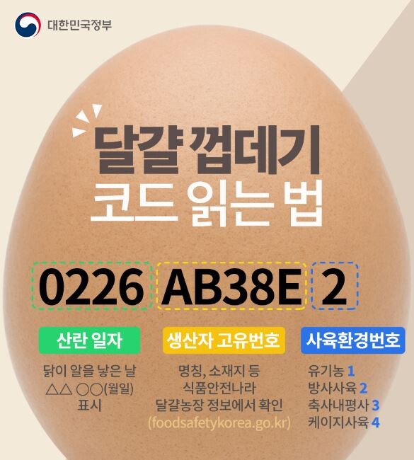 시중에 유통되는 계란의 난각(껍데기)에는 사육환경, 농가정보, 산란일자 등을 확인할 수 있는 숫자 표기가 되어 있다. 예를 들어 ‘0226 AB38E2’라고 표기되어 있다면, ‘AB38E’로 분류된 농가에서 방사사육을 통해 2월 26일 생산한(산란한) 계란이다.