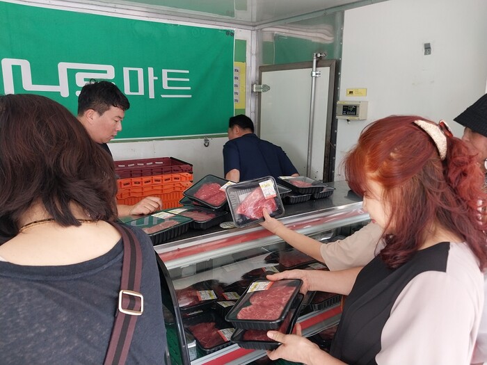 | ▲ 추석 맞이 강진산 한우 세트를 구입하고 있는 소비자들 / 자료제공 = 강진군 제공 |