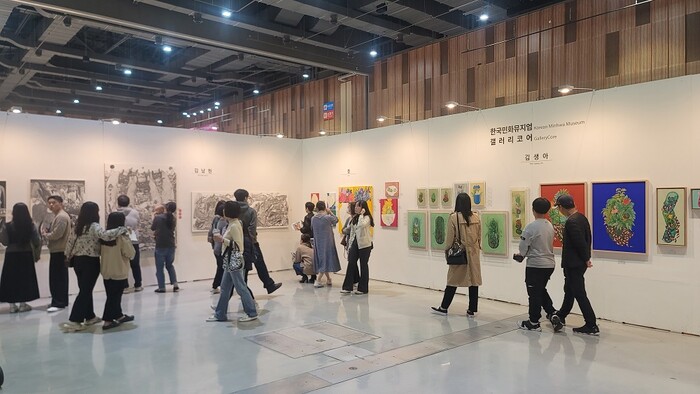 | ▲ 한국민화뮤지엄이 지난 19~22일까지 울산전시컨벤션센터(UECO)에서 개최된 2023년 울산국제아트페어에 참여한 가운데. 많은 관람객들이 전시장을 찾아 민화 작품들을 관전하고 있다. / 강진군 제공 |
