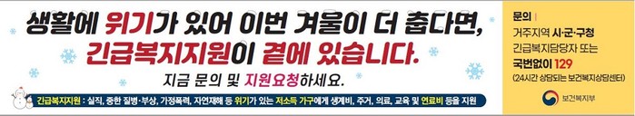 군은 관내 인구 이동 량이 많은 장소에 홍보 현수막을 게첨하고 반상회보를 게시하는 등 도움이 필요한 가구 발굴에 적극 나서고 있으며, 주위의 적극적인 제보를 기다리고 있다.