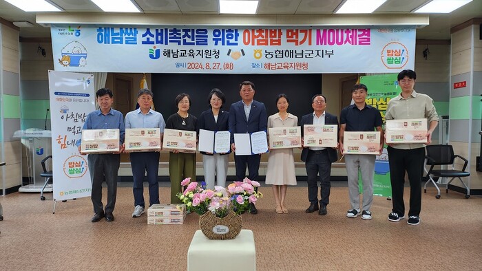 [해남=정찬남 기자] 전라남도해남교육지원청(교육장 이자영)은 27일 학생들의 쌀밥에 대한 관심과 올바른 쌀문화 식습관 형성을 위해 농협중앙회해남군지부와 쌀 소비 촉진을 위한 ‘아침밥 먹기 상생협력’ 협약을 체결했다.