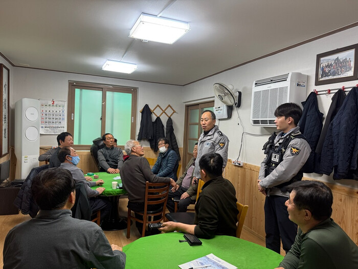 | ▲ 해남경찰서 황산파출소, 황산면 관내 마을회관에서 주민 대상 화재 예방 수칙 준수 등 당부 / 해남경찰서 제공 |