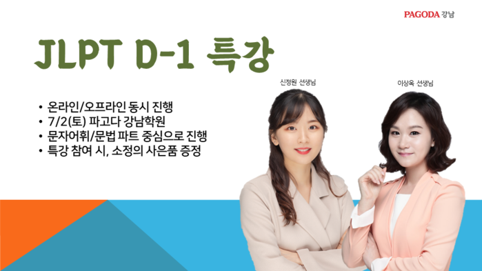 강남 파고다 일본어학원에서 개최하는 ‘JLPT D-1 특강’은 파고다 강남학원에서 오프라인으로 진행하며, 온라인으로 실시간 LIVE 송출을 진행할 예정이다.