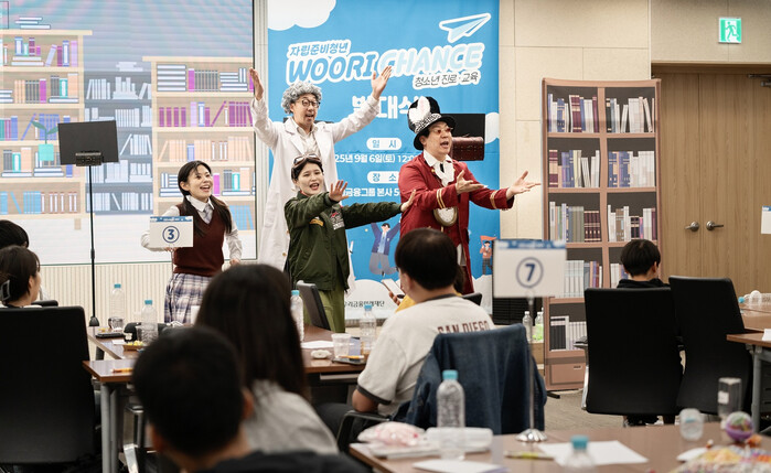| ▲ 2025 자립준비청년 ‘WOORI Chance’ 청소년 진로·교육 사업 발대식 ‘진로연극’ 프로그램에서 아츠컴퍼니 뜨락이 뮤지컬 공연을 하고 있는 모습. (사진 제공=월드비전) |
