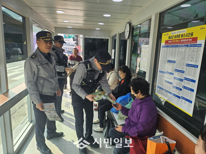 | ▲ 해남경찰서 읍내지구대원 등이 최근 봄철 교통사고 예방 위해 버스 정류장에서 버스를 기다리고 있는 군민 등에게 새로운 도로교통법 등에 대해 교통 홍보 활동을 하고 있다./ 해남경찰서 제공 |