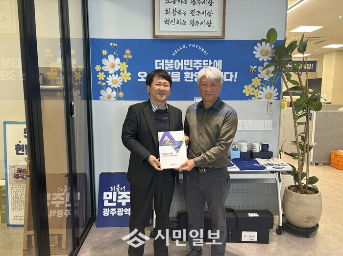 | ▲ 이상갑 광주광역시 문화경제부시장(왼 쪽), 9일 오전 더불어민주당 광주시당 방문 광주시 대선공약 보고서 전달 기념촬영 /광주광역시 제공 |