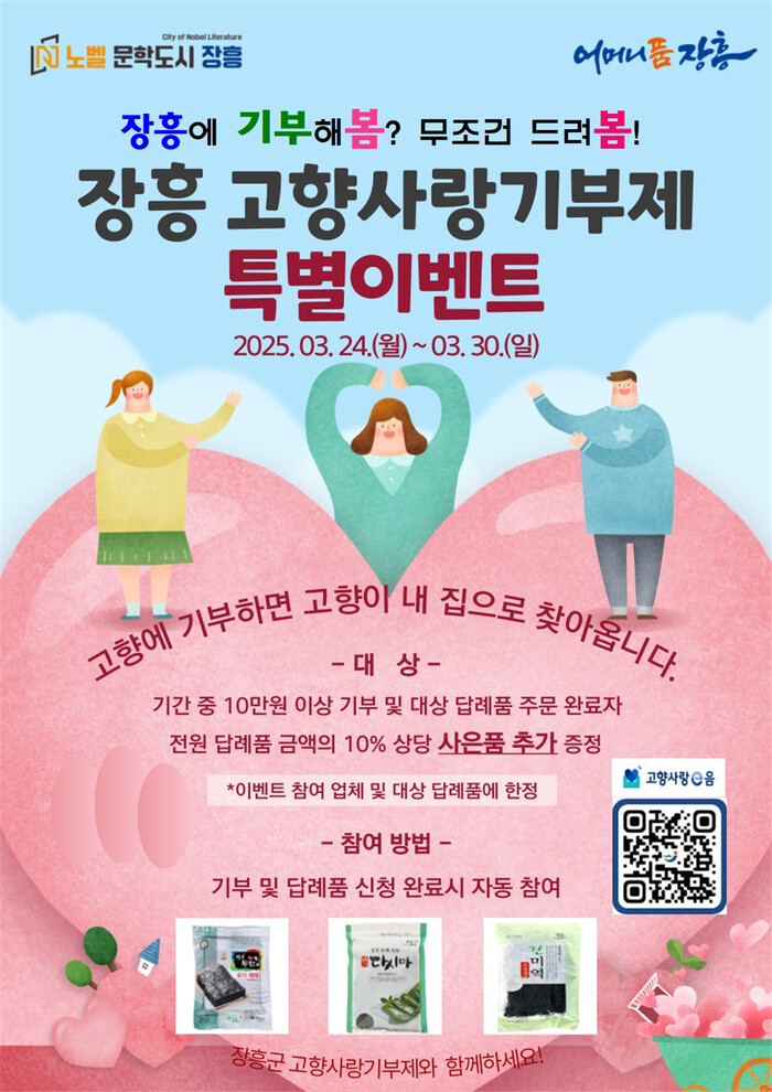 [장흥=장영채 기자] 전남 장흥군이 고향사랑기부제에 대한 참여를 유도하고 지역경제 활성화를 위해 ‘장흥에 기부해봄? 무조건 드려봄!’ 이벤트를 실시한다.