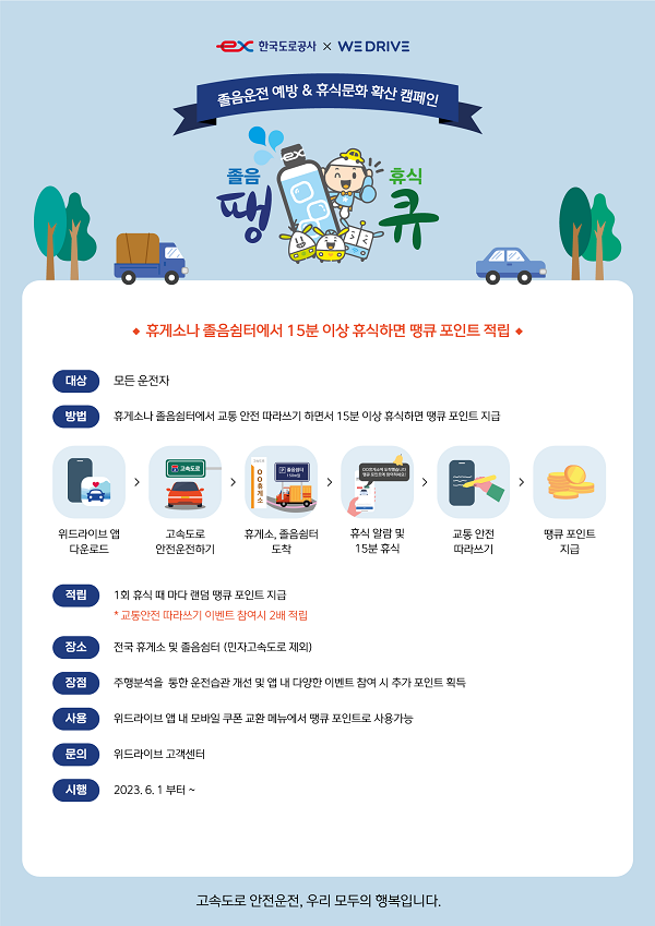 6월 1일부터 오는 12월 말까지 진행되는 '안전운전 졸음 땡 휴식 큐'는 참여형 대국민 캠페인이다. 화물차 및 일반 승용차량 운전자들에게 2시간 이상 운전 시 15분 휴식을 취할 때마다 보상을 제공한다. 휴식을 취하는 공간은 전국 모든 휴게시설(휴게소, 졸음쉼터 - 민자고속도로 제외)이다.