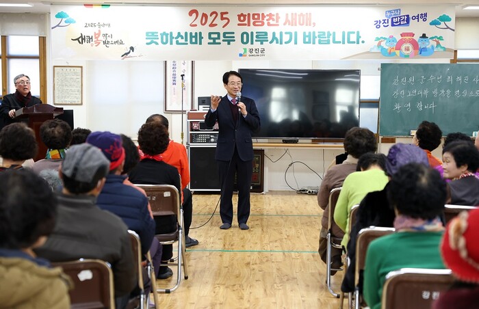 지난 3일 강진원 강진군수는 1981년에 설립된 (사)대한노인회 강진군지회(회장 황호용)를 방문, 2025년 새해 첫 개강을 맞은 노인대학 수강생들과 만남의 시간을 가졌다. 노인대학은 총 213명의 등록 회원으로 구성돼 있으며, 이날 강 군수는 수강생들에게 큰절을 올리며 새해 인사를 전했다.