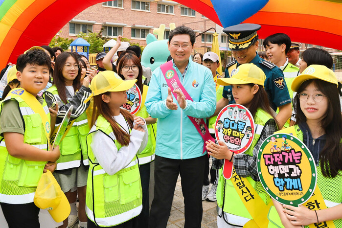 이 시장 등은 학생들에게 교통안전 홍보물품을 나눠주고, 안전취약 지역을 운행 중인 차량 운전자에게는 ‘일단멈춤! 앞에 있는 아이는 당신의 아이입니다’는 슬로건을 전했다.