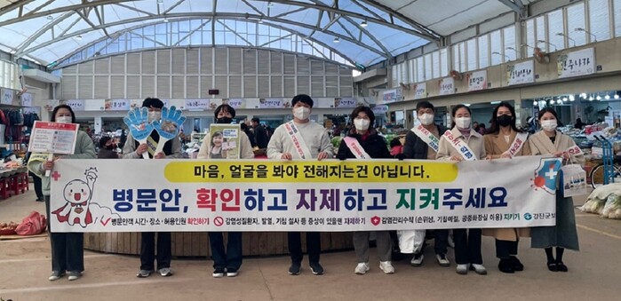 강진군보건소는 지난 4일 전라남도 강진의료원 및 강진군 의사회와 함께 강진읍 시장 일원에서 ‘확인하기, 자제하기, 지켜주기’란 슬로건으로 병문안 문화개선 캠페인을 가졌다.