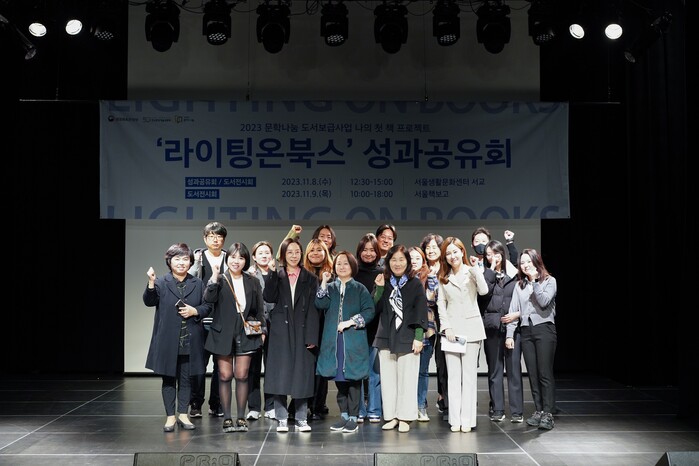 | ▲ 2023년 11월 8일 서울생활문화센터 서교스퀘어에서 진행된 문학나눔 도서보급사업 나의 첫 책 프로젝트 성과공유회에 참석한 작가 등의 기념촬영. (사진=한국문화예술위원회 제공) |