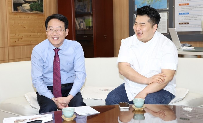 | ▲ 강진원 강진군수가 민선8기 ‘맛의 도시 강진 조성사업’의 일환으로 군의 대표 먹거리 개발과 레시피 교육 일정에 맞춰 이원일 셰프와 지난 10일 강진군청에서 차담을 나누고 있다. / 강진군 제공 |