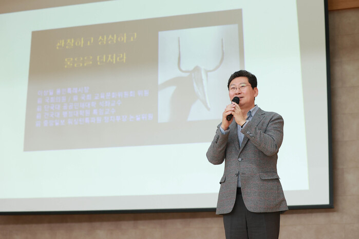 이상일 시장은 카르타고의 명장 한니발, 스타벅스 CEO 하워드 슐츠, 이순신 장군 등을 예시로 들어 상상력과 관찰력, 리더십에 대한 강의를 이어갔다.