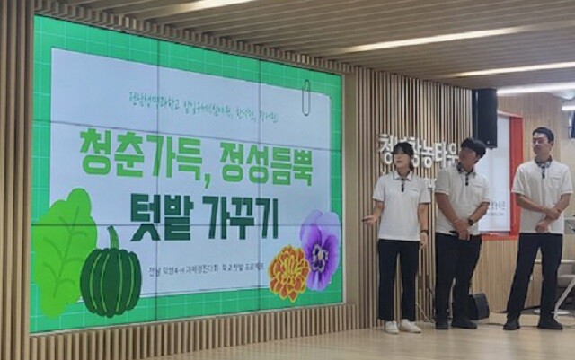 | ▲ 전남생명과학고 학생들이 최근 열린 전라남도 4-H과제 경진대회에서.'청춘가득, 정성듬뿍 텃밭 가꾸기' 주제 발표를 하고 있다. / 강진군 제공 |